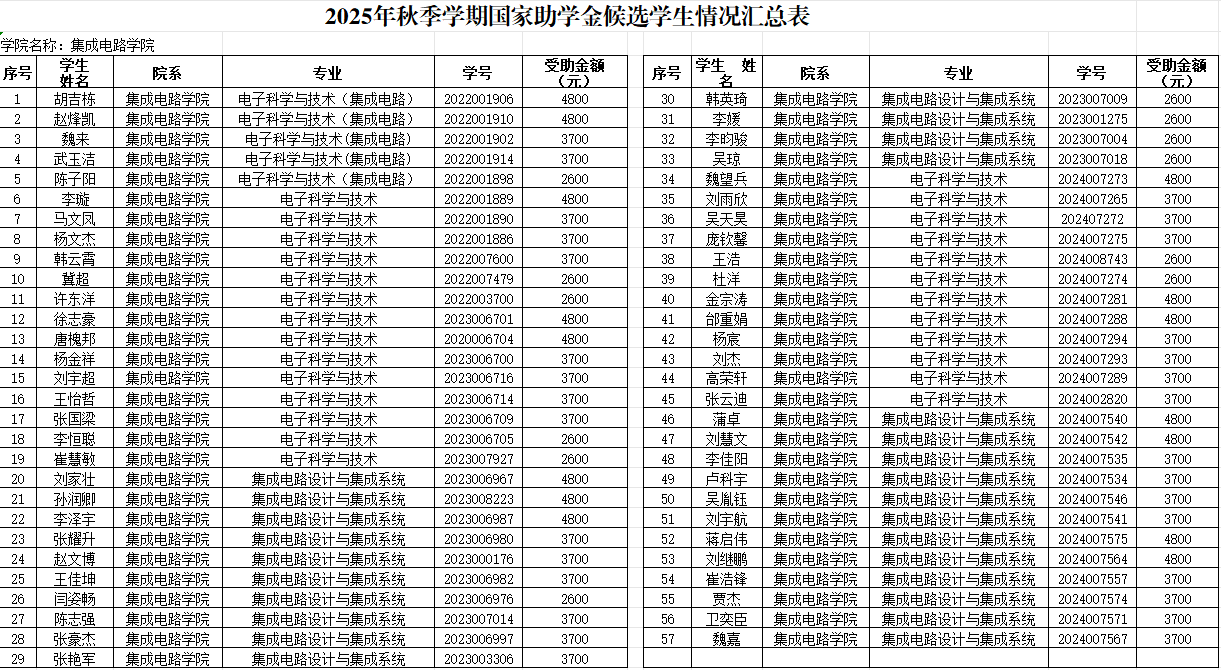 根据《关于开展2024-2025学年本科生国家助学金评选工作的通知》的相关文件精神,经个人申报、资格审查、评议小组评定、学院评审委员会评选,学院党政联席会议审批通过,拟推荐胡吉栋等57名学生为2024-2025学年本科生国家助学金候选人,现予公示。公示时间为2025年10月11日至10月14日,请全院师生对公示情况进行监督,若有异议,请于公示期内将书面意见反馈到学院学生工作办公室,逾期不予受理。