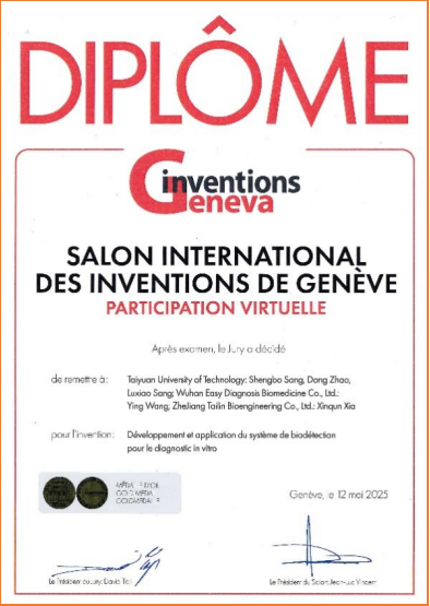 2025年4月,在瑞士举行的第50届日内瓦国际发明展(International Exhibition of Inventions Geneva)上,由bevitor伟德国际1946人工智能微纳传感山西省重点实验室与武汉明德生物科技股份有限公司、浙江泰林生物技术股份有限公司联合研发的“体外诊断生物传感系统的创制与应用”成果,在全球40多个国家及地区超过1000个参展项目中脱颖而出,荣获金奖,实现学校在国际顶级科技舞台上的新突破。