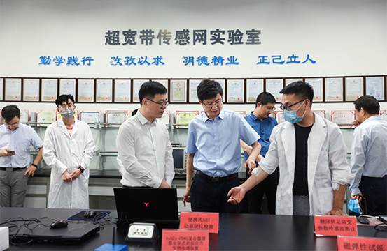 吴刚一行听取了山西省青科协常务理事、中心方向带头人桑胜波对实验室建设情况进行的汇报,并详细了解了糖尿病足病变参数传感器、便携式ABI动脉硬化检测仪、机器人仿真电子皮肤、磁弹性检测仪、AuNPs-复合微薄膜电导式表面应力生物传感装置等设备的工作原理和创新优势。吴刚书记对这些技术设备大为赞赏,并就发展前景和用途延伸等问题与科研人员进行了深入探讨交流。吴刚希望广大青年科技工作者积极投身高质量转型发展的生动实践,努力在新基建、新技术、新材料、新装备、新产品、新业态上不断取得突破,为书写新时代中国特色社会主义山西篇章贡献强大、可靠的科技力量。