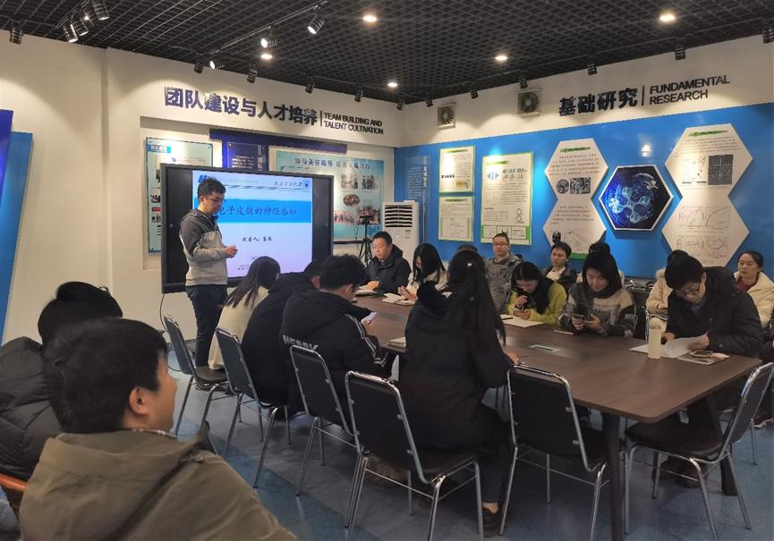 本次学术报告的汇报人为博士生裴臻,汇报的内容是电子皮肤神经感知的相关研究。主要介绍了人工传出神经控制小鼠运动、假肢的触觉感知、当前的相关实验进展。人工传入(或感觉)神经已经可以与昆虫或小鼠的腿相连,以展示简单的反射作用,但关于人工传出(或运动)神经可以控制脊椎动物的生物运动反应的研究还较少,对与未来生物相容性和节能神经康复设备具有重大意义。此次报告讲述了电子皮肤神经感知的当前方法、研究进展和应用,为下一步研究提供了理论基础和新的思路。参会的各位老师、学生就学术报告相关内容进行了热烈的讨论。