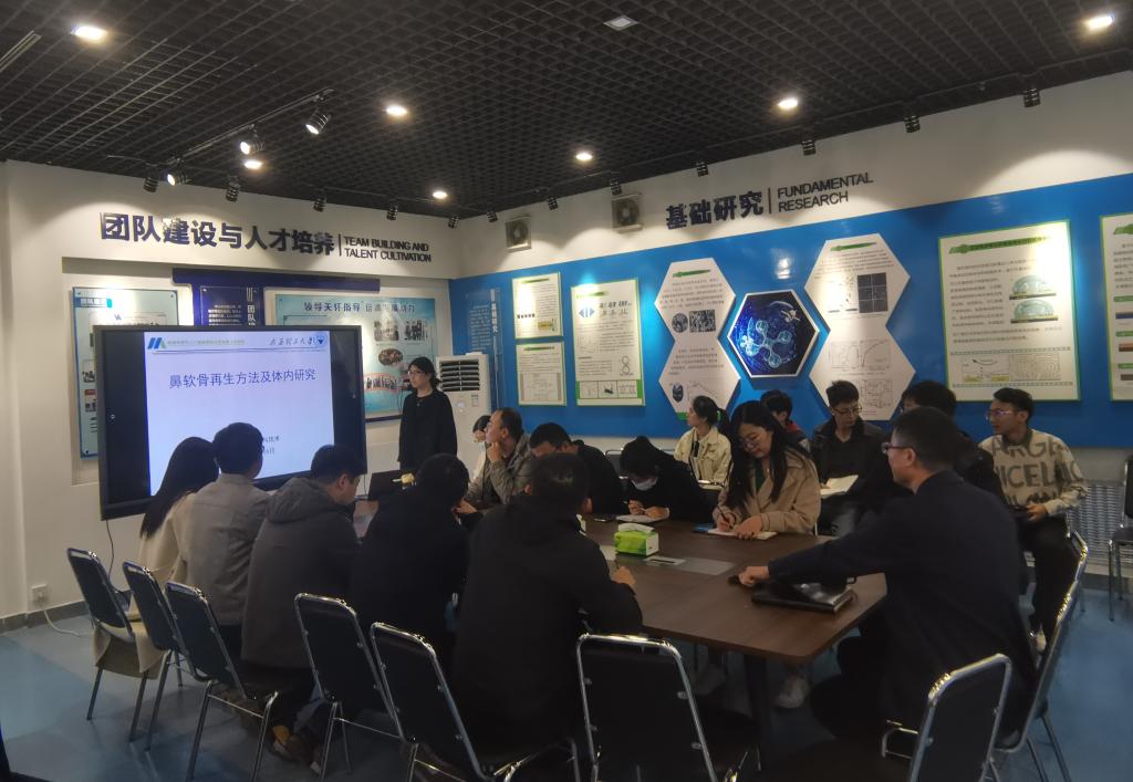 本次学术报告汇报人为贾雯丹博士,汇报的内容是鼻软骨再生方法及体内研究。贾雯丹博士谈到目前如何培养具有与天然鼻软骨相媲美的生物化学和生物力学性能的新软骨是一个巨大的挑战,而检测生物材料是否适用于组织工程的最重要标准是评价体内组织再生。基于已选用的生物材料,需要探索其植入动物体内的生物相容性情况与再生情况。因此,针对已有文献的体内实验,从体内实验选用的细胞类型、体内实验选用的动物种属、材料与动物的分组情况、再生的部位选择、植入方法(直接植入还是培养之后植入)、具体实验内容(有没有做炎症测试等)、实验周期、模型构建方法等方面进行了文献总结与归纳,制定了初步的体内实验计划。随后介绍了自己近期的工作进展,即体外实验的材料性能表征和3D打印情况。参会的各位老师学生就学术报告相关内容进行了热烈的讨论。