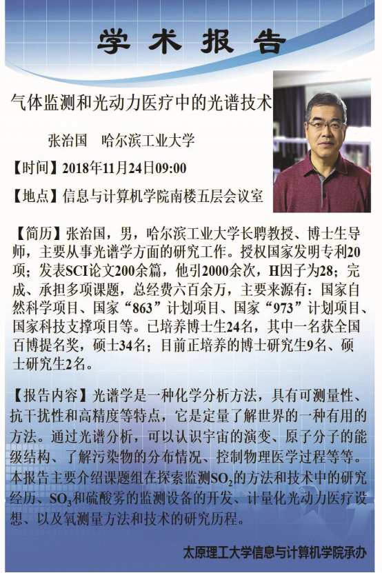 2018年11月24日,应信息与计算机学院副院长(主持)桑胜波教授邀请,哈尔滨工业大学大学张治国教授在我院做了题为《气体监测和光动力医疗中的光谱技术》的学术报告。报告主要介绍了基于光谱技术的SO2、SO3和硫酸雾监测及相应的监测设备的开发,计量化光动力医疗设想,以及氧测量方法和技术。
