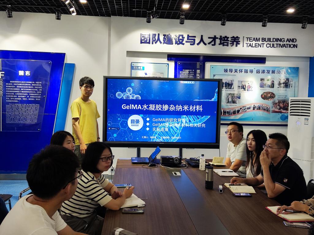 本次学术报告汇报人为申治中博士生,汇报的内容是GelMA水凝胶掺杂纳米材料的相关研究。高分子水凝胶是一种非常吸引人的材料,可用于组织修复的3D支架及治疗分子和细胞的传递系统。其中,甲基丙烯酸明胶(GelMA)已成为一种具有代表性的水凝胶材料,在生物医学领域有着广泛的应用。申博士首先介绍了调节GelMA水凝胶理化性能的不同方法,基于GelMA的水凝胶研究致力于将其与生物活性和功能纳米材料结合,旨在增强GelMA的物理化学和生物性能。接着,针对纳米材料掺杂的相关研究进行了重点介绍,包括对碳纳米管、氧化石墨烯、纳米银颗粒、磁性纳米材料等多种纳米掺杂材料的相关研究。最后,介绍了自己的研究进展,及未来研究计划。参会的各位老师、学生就学术报告相关内容进行了热烈的讨论。