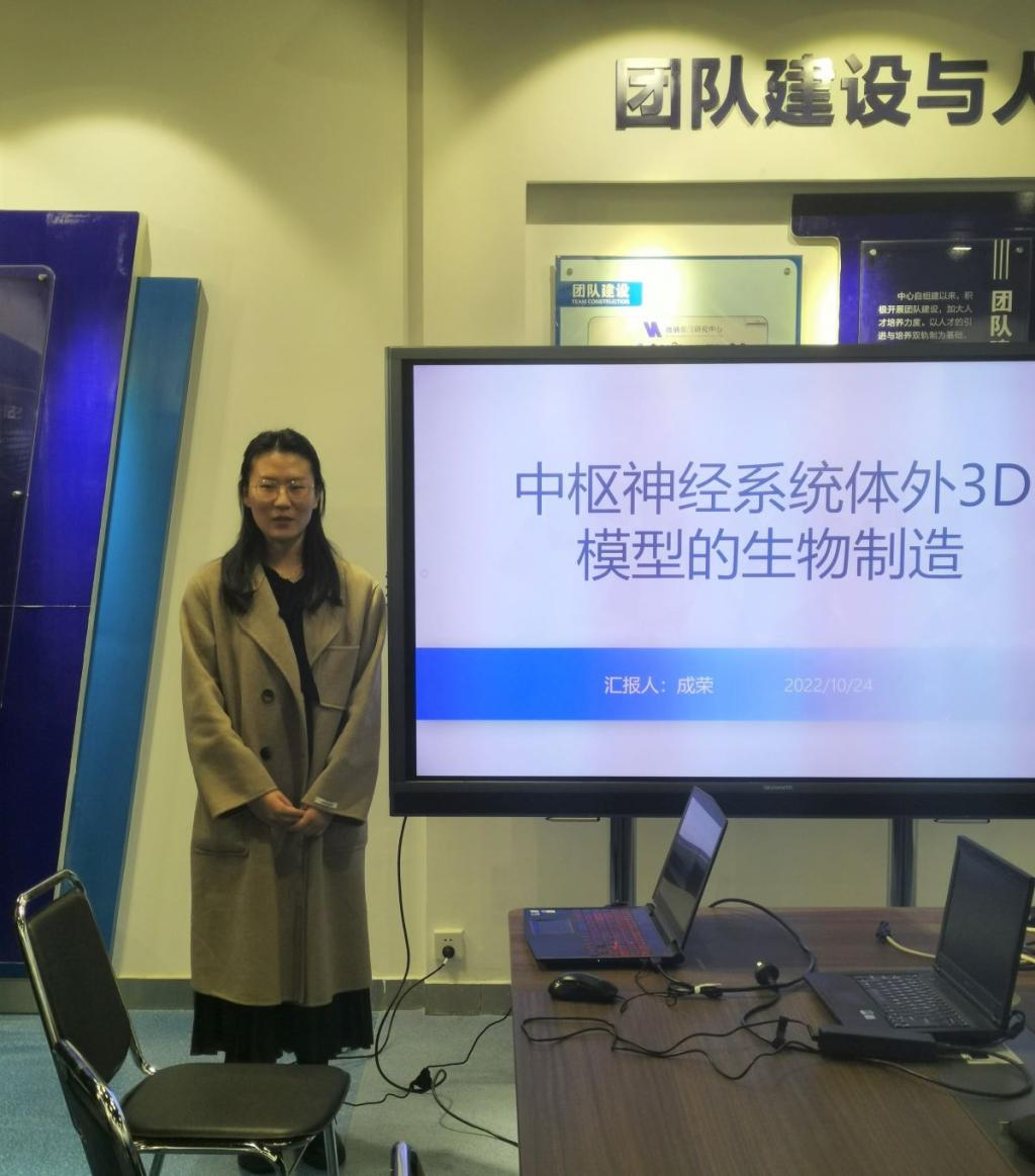 本次学术报告汇报人为成荣博士,汇报的内容是中枢神经系统体外3D模型的生物制造。成荣博士首先介绍了动物模型及体外2D细胞培养用于模拟神经退行性病变进程时的不足之处,提出了3D培养能够重建体内微环境,是较为可行的解决方案。并讨论了体外3D模型在中枢神经系统(CNS)疾病中的挑战,关注打印技术的应用在3D微环境生成上的位置控制,以及生物制造技术需要塑造具有细胞成分代表大脑生化和生物物理参数微环境。通过介绍相关领域的研究成果,帮助大家更好的了解了基于3D打印神经组织工程体外模型制造的原理与应用价值。参会的各位老师学生就学术报告相关内容进行了热烈的讨论。