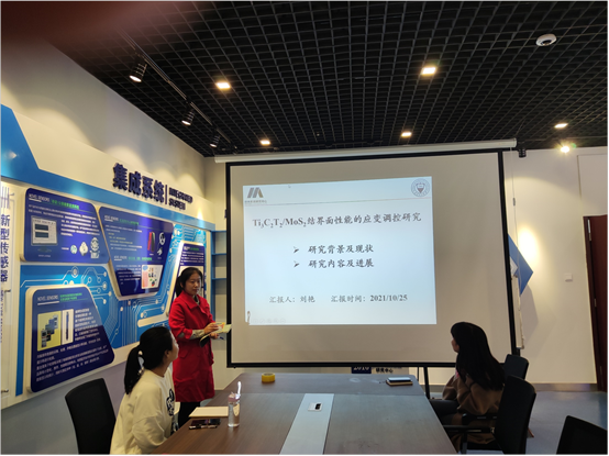 刘艳博士从研究背景、研究进展两方面进行了题为“Ti3C2T2/MoS2结界面性能的应变调控研究”的汇报。刘艳博士基于金属半导体接触界面调控的意义和应变调控手段,讲解了基于石墨烯金半结的平面外应变调控规律,介绍了其研究模型和调控方法。随后,各位老师和同学就汇报相关问题进行了热烈的讨论。