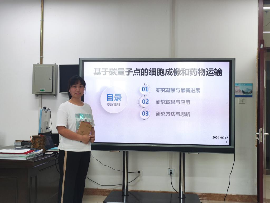 本次学术报告汇报人为张博叶。荧光碳量子点(CDs)是近年来最受人们关注的碳纳米材料之一,具有光学性质优异、生物毒性小、易于功能化、制备简单、成本低等优点,被广泛应用于研发新的生物成像探针。荧光成像在从细胞和组织病理学诊断到肿瘤定位和图像指导手术的临床程序中具有广阔的前景。亚细胞器的特定局部成像对于深入了解生物学具有重要意义。目前,为了更有效地,广泛地和实用地使用碳量子点,仍然需要有效的亚细胞选择和筛选。碳量子点为我们提供了一个强大的细胞核成像工具,用于研究细胞器与基本生物过程、疾病发展或药物相互作用之间的复杂关系。参会的各位老师学生就学术报告相关内容进行了热烈的讨论。